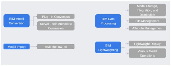 Figure 2) within the framework interface. The BIM + GIS model that requires lightweight conversion from the modeling software to the platform supports two methods: direct local conversion via software plugins and server-based conversion through online platforms. The former offers more options and ensures better confidentiality, while the latter offers faster processing with reduced local resource usage. The cloud-based conversion method requires no waiting time because it uploads the model source file directly, with the platform server handling the conversion in the background (