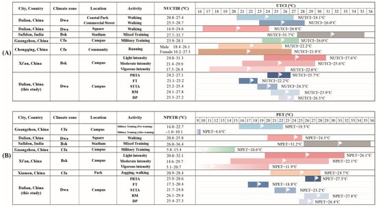 - Fang, Z.; Xu, X.; Zhou, X.; Deng, S.; Wu, H.; Liu, J.; Lin, Z. Investigation into the Thermal Comfort of University Students Conducting Outdoor Training. Build. Environ. 2019, 149, 26–38. [Google Scholar] [CrossRef]