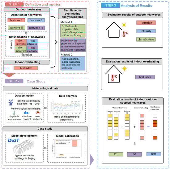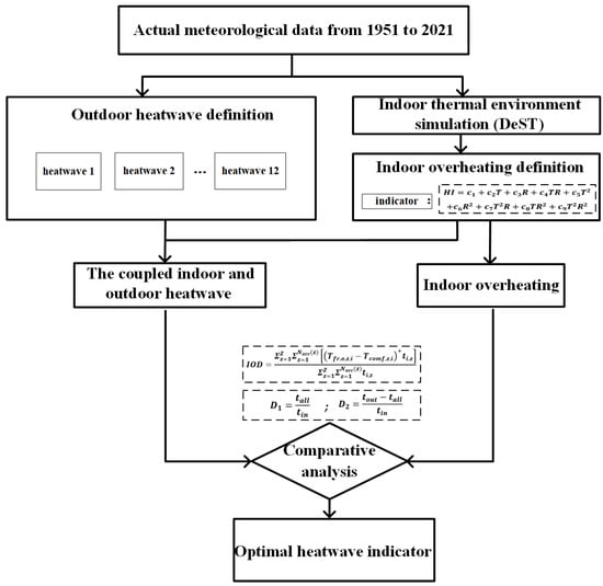 As shown in Figure 2, this study establishes a comprehensive workflow with Beijing as the research object. Based on the 71 years of long-term meteorological data for Beijing, this study employs DeST 3.0 software to conduct dynamic simulation of the indoor environment and conducts quantitative analysis with visual representation of outdoor heatwaves detected under different definition standards. These analyses incorporate multi-dimensional indicators including heatwave intensity, duration, and occurrence frequency. At the same time, taking the heat index (HI) as the evaluation indicator, it analyzes the distribution characteristics of the indoor thermal environment over 71 years. Finally, through the analysis of indoor overheating degree (IOD) and the coincidence degree between indoor and outdoor heatwave events, the study develops a coupled evaluation model for composite heatwaves. This model enables comprehensive evaluation of building thermal environment risks.