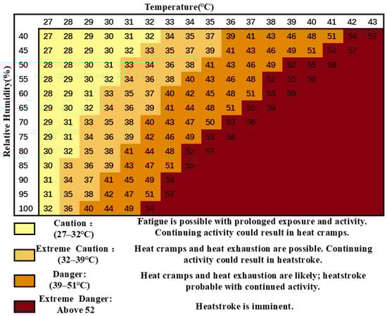 In high-temp and high-humidity environments, the human body often feels discomfort related to both temperature and humidity increases. The HI, an indicator for heat stress risk evaluation, has been used by the National Weather Service for heat safety assessment since 1979 and is an important reference for the Occupational Safety and Health Administration (OSHA) []. The HI is easy to calculate and can accurately reflect the impact of such environments on human health. It is commonly used for outdoor human heat stress assessment and has been adopted by institutions like the National Oceanic and Atmospheric Administration (NOAA), the World Health Organization, and OSHA [,]. Also, because the conditions it targets, namely, shade and gentle breeze, are similar to indoor environments, it has been used to evaluate indoor environments in previous studies [,]. Therefore, this study selects the HI as the resilience performance indicator for evaluating human health risks under indoor high-temperature and high-humidity conditions and the indicator for defining indoor overheating situations.