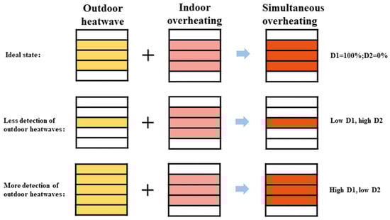 Here, is the simultaneous overheating period (h); is the outdoor overheating period (h); and is the indoor overheating period (h).