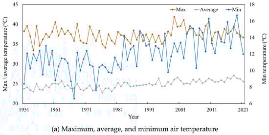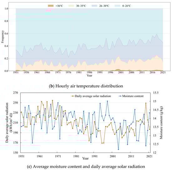 Figure 5 illustrates the variation patterns of AMY data during the cooling season (1 June–15 September) over a 71-year period. This study conducted a thorough analysis of meteorological parameters, including mean, maximum, and hourly air temperatures (°C), average moisture content (g/kg), and daily average solar radiation [kWh/(m2·d)].