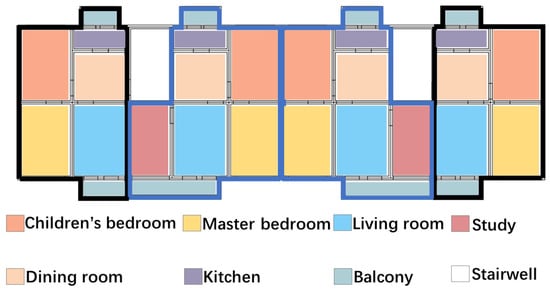 The building layout was standard (Figure 6), with details listed in Table 4. It comprised four 2.7 m-high floors, totaling 1396.8 m2 []. Key parameters included a 0.378 m−1 shape coefficient and 0.26 window-to-wall ratio. Each floor housed four units: Type A (72.72 m2, black outline) and Type B (88.92 m2, blue outline). Unit layouts included master and children’s bedrooms; living, study, and dining rooms; and a kitchen. Split AC systems provided cooling from June 1 to September 15.