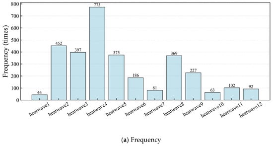 This section presents the evaluation results of outdoor heatwaves, and the definitions of relevant indicators are detailed in Section 2.2.1. Figure 7 shows a comparative analysis of heatwave events under different definitions over a 71-year period. As shown in Figure 7a, within the time span of 71 years, heatwave events screened based on different determination criteria exhibit significant differences in frequency distribution. Among them, heatwave 4 stands out with the highest number of occurrences, reaching 773 times, while heatwave 1 has the lowest number of occurrences, only 44 times. Such a significant difference in frequencies reflects the impact of different heatwave definition methods on the identification of heatwave events.