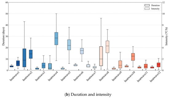 To conduct an in-depth analysis of the characteristics of heatwave events defined by different heatwave indicators, we have classified heatwave events. In this study, the characteristics of heatwaves are reflected by their duration and intensity []. Specifically, the duration refers to the number of days during which the heatwave persists. The intensity of a heatwave event is calculated in a specific way, that is, the ratio of the sum of degree-hours when the hourly air temperature is higher than the threshold value to the duration, as shown in Equation (1) []. By comprehensively considering these two key indicators, namely duration and intensity, the risks posed by heatwave events can be evaluated more scientifically. This, in turn, provides a solid and crucial basis for formulating effective and targeted response strategies.