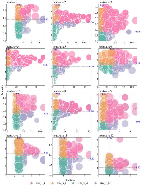 In order to systematically classify and conduct a comparative analysis of different types of heatwave events, this study first carried out a detailed statistical analysis of various heatwave indicators and screened out the key indicators of duration and intensity that can effectively distinguish the characteristics of heatwaves. Figure 8 shows a bubble chart of heatwave events screened by different definition methods. Each bubble in the chart presents three key characteristics of the events: duration, intensity, and daily total radiation. The blue numbers in the figure represent the median values of duration and intensity for different types of heatwaves, which are used to distinguish between heatwave types. Two dashed lines divide the chart into four regions, representing four types of heatwaves displayed in different colors.