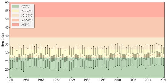 As can be seen from the Figure 9, over the 71-year period, for most of the time, the HI of this building is within the safe range below 27 °C, and the likelihood of people facing health risks due to high air temperatures is relatively low. However, it is quite common for the HI to be in the range of 27–32 °C. People who engage in activities in this environment for a long time need to be vigilant about the risks of fatigue and heat cramps. In contrast, situations where the HI exceeds 32–39 °C occur relatively less frequently. Although the HI is relatively safe most of the time, this building still frequently enters the air temperature range that warrants a warning. This also indicates that although the indoor air temperature environment is relatively comfortable in most cases, during certain periods, the hazards posed by high air temperatures still require high attention. It is worth noting that Beijing is located in northern China, with a dry climate, and the HI has not exceeded the dangerous threshold. However, in the humid and hot southern regions, the importance of the indoor air temperature situation is even more prominent. The distribution proportion of the HI in each interval shows certain fluctuations. Since 1980, the median value of the HI is mostly higher than 27 °C.