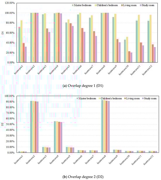 Figure 10, taking the four main rooms on the fourth floor of the building as examples, shows the degree of coincidence between outdoor heatwave events and indoor overheating under different definitions over a period of 71 years. The higher the D1 value is, the higher the degree of coincidence of the overheating phenomenon between indoors and outdoors during the period of indoor overheating (Figure 10a). It can be seen that the D1 values of heatwave 2, heatwave 4, and heatwave 8 are nearly 100%, which means that during all periods of indoor overheating, outdoor overheating occurs simultaneously, showing a high degree of coupling between the two. Following them are heatwave 3, heatwave 5, heatwave 6, and heatwave 7, with relatively lower D1 values. In terms of the D2 index, the lower the value is, the higher the degree of coincidence of indoor and outdoor overheating (Figure 10b). The D2 values of heatwave 1, heatwave 6, heatwave 7, heatwave 9, heatwave 10, heatwave 11, and heatwave 12 are relatively low, indicating that when indoor overheating occurs, a large number of outdoor overheating situations are covered. It is worth noting that although heatwave 2, heatwave 4, and heatwave 8 can comprehensively capture indoor overheating situations, the number of screened outdoor overheating events is relatively large, presenting a certain degree of redundancy. In contrast, heatwave 6 and heatwave 7 can accurately identify indoor overheating while screening out fewer outdoor heatwave events, demonstrating higher detection efficiency and accuracy.