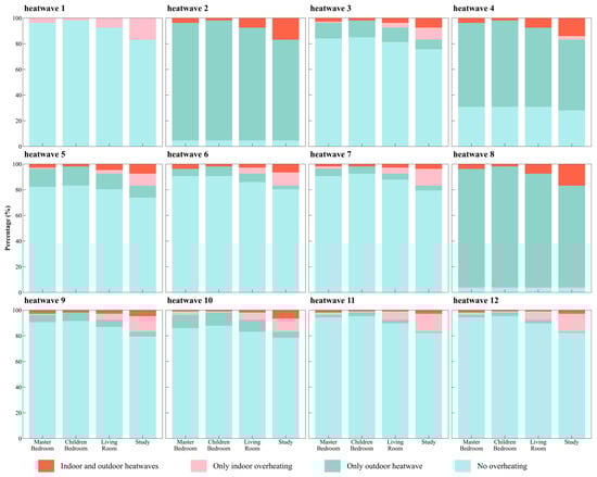 Figure 11 shows the coincidence of indoor and outdoor overheating in the main rooms, such as the master bedroom, children’s room, living room, and study on the fourth floor (the top floor) during the cooling season in 2019. In the figure, the periods of indoor overheating are marked in red, the periods of outdoor heatwaves are marked in blue, and the moments of simultaneous indoor and outdoor overheating are indicated in gray. It can be seen from the figure that during the detection of heatwave 2, heatwave 4, and heatwave 8, the detection frequency of outdoor heatwaves is relatively high. During heatwave 1, although indoor overheating occurs, no heatwaves are detected outdoors. It is worth noting that for heatwave 3, heatwave 5, heatwave 6, heatwave 7, and heatwave 10, the degree of coincidence of indoor and outdoor overheating is quite significant.