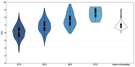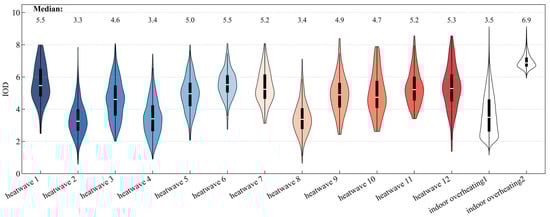 In terms of the distribution pattern of the degree of overheating, the “violin plots” corresponding to various outdoor heatwave events show significant differences, indicating that there are essential distinctions in the distribution characteristics of the degree of overheating under different heatwave definitions, and there are obvious differences from indoor overheating phenomena. Specifically, when adopting 32 °C as the threshold, the degree of overheating demonstrates relatively higher values, with a concentrated distribution primarily ranging between 6 and 8 °C. In contrast, setting the threshold at 27 °C results in a more dispersed distribution pattern spanning 0–10 °C. This distribution difference reveals the inherent connection between thresholds and risk assessment scales. The 32 °C threshold focuses on high-intensity indoor overheating events, accurately identifying extreme scenarios that may trigger acute health hazards such as heatstroke and heat exhaustion, providing a critical basis for emergency responses. In contrast, the 27 °C threshold, with its broader temperature coverage, effectively captures low-intensity overheating events. Although these events correspond to lower degrees of overheating, they may play a more sensitive role in risk identification for early warning systems. In the risk early warning system, the 27 °C threshold serves as an early risk identification indicator to achieve risk prediction by capturing temperature fluctuation trends, while the 32 °C threshold acts as an emergency response trigger to capture more intense temperature fluctuations. Meanwhile, the outdoor overheating degree exhibits an intermediate distribution pattern, mainly concentrated within the 2–8 °C range. Among them, the distribution of the degree of overheating for heatwave 1, heatwave 6, heatwave 7, heatwave 10, and heatwave 11 is particularly concentrated, demonstrating the stability of the overheating phenomenon under this definition. For the “violin plot” of indoor overheating, its overall shape is in sharp contrast with that of some outdoor heatwaves. When a HI of 32 °C is used as the evaluation threshold, the degree of overheating mainly concentrates in the range of 6–10 °C, and when a HI of 27 °C is used as the evaluation threshold, the degree of overheating is more dispersed.