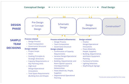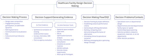 Globally, the vulnerabilities of healthcare facilities have been revealed to be a result of regional conflicts [], SARS-CoV-2 and other diseases [,], extreme weather [], climate change, and other challenges [,], while opportunities have arisen with rapid shifts in clinical practice and care delivery [,]. Healthcare facility quality evaluations in developed and developing countries identify multifaceted elements associated with quality, linking stakeholder satisfaction/well-being, hospital management, building maintenance, and healthcare policy with improving facility quality []. Prepared and resilient healthcare facilities are essential to the delivery of all levels of care irrespective of location []. It is in this context that the complexity and critical impact of decision making (DM) during the design of healthcare facilities are situated. Sequential and iterative decision making is deeply embedded in the design process of healthcare facilities. Healthcare facility design (HCFD) refers to activities conducted to design a new or renovated building or building space, generally undertaken in phases that may begin with establishing the project vision; determining building and room organization, shape, and capacity; developing operational and clinical systems; and continuing through a detailed design of materials, furnishings, and equipment. The complexity of designing healthcare environments emerges from the critical interdependencies between the physical environment, clinical pathways, operational efficiency, and the needs and values of healthcare teams and the patients and families who seek care. In design, decision making and decision support are most often considered in the context of option development and selection; however, there are also behavioral challenges in team decision making during design, as presented in the literature. As the environment in which a multitude of encounters and interactions occur, facilities are an integral part of a healthcare system. The physical environment influences almost every touchpoint in that system. In healthcare settings, the alignment between people, care, the environment, and outcomes is paramount to supporting quality inputs and outcomes. Healthcare facilities are more than a “backdrop” to care []; they shape workflows and influence the cognitive, emotional, and physical states of those who occupy them. Well-designed facilities are a strategic advantage, conferring competitive advantage and contributing to important health benefits and operational performance [,]. Healthcare has been described as a complex and adaptive system of systems [], and healthcare facilities are among the most complex to design []. This complexity in healthcare facility design can be attributed to the presence of multiple stakeholders; multiple, and sometimes competing, priorities; significant contingencies among care pathways and the support systems for patient care; considerable uncertainties regarding volumes and emerging clinical directions; evolving regulatory environments; and shifting strategic needs, to name some. The decisions made by design teams, over what can be years of planning, shape these environments in significant ways.
