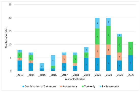 A slight upward trend in papers considering multiple aspects of decision making, rather than an exclusive focus on evidence, tools, or process, is observed in this set of papers over time. Figure 4 provides a breakdown of the literature by the area of focus over the entire period.