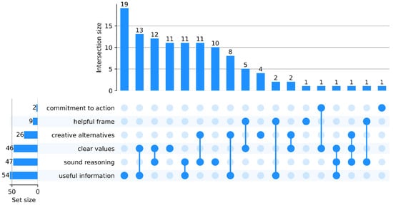 In terms of intersecting dimensions, the most common intersections are useful information with clear values (13 papers) and clear values with sound reasoning (12 papers), reflecting the importance of stakeholder engagement in design and possibly the growing influence of Lean and systems engineering methods in design. The intersection of useful information with sound reasoning or sound reasoning with creative alternatives was present in 22 papers. Seeking or creating new information, generating alternatives, comparing, and optimizing alternatives are often intersecting activities during design. This overlap may be attributed to the fact that design follows an iterative, looping path whereby alternatives are generated, evaluated, and refined or optimized in a non-linear fashion. Just two papers incorporate more than two decision quality elements. Commitment to action receives limited attention in this HCFD literature set reporting that Lean-led approaches contribute to new design innovation adoption [], noting that structures and inclusive group analyses of options lead to innovation [], and reporting that stakeholders who are more engaged in decision-making processes adapt quicker to, and experience greater satisfaction with new facilities [].