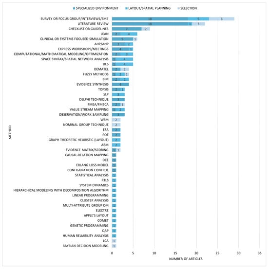 Healthcare facilities provide environments for many varied clinical practices as well as administrative, operational, and supportive functions. Specialized spaces require considerable effort and time to design, are functionally critical, and involve spaces that are repeated multiple times in one building. A new inpatient tower design, for example, may repeat an inpatient room upwards of 100 to 400 times. Other specialized spaces such as operating rooms or imaging rooms may be fewer in number and are highly technical. These specialized spaces are care environments where interdisciplinary teams deliver patient care activities. Therefore, group decisions often require building consensus and negotiating trade-offs with a diversity of stakeholders. In the identified literature, the tools and methods applied to the design decisioning process focus on understanding needs and values; building consensus around needs and expected outcomes; aligning design to existing and new workflows through process mapping, visualization, and prototyping; and decision modeling. Figure 7 summarizes the methodologies applied to each type of decision problem. Table A1 provides a summary of articles by settings, methods, country, and decision quality dimensions.