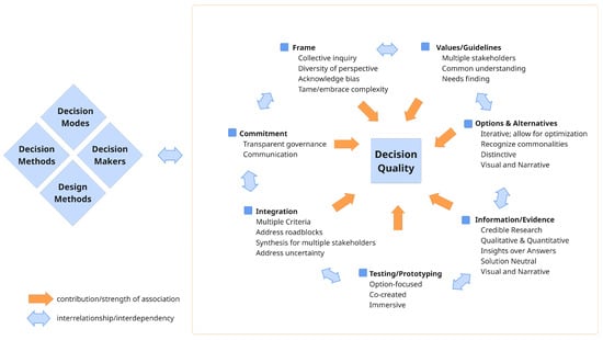 Decision quality concepts can be found in diverse domains such as pharmaceuticals, land management, and medical decision making. One such framework is the Decision Quality Chain (DQC), first proposed by Matheson [] and elaborated by Spetzler, Winter, and Meyer []. The DQC was built on the foundations of decision theory and decision analysis and expanded to incorporate research related to behavioral decision science research emerging in the mid-2010s. The DQC model describes six distinct dimensions of decision making, conceptualized as an interlinked chain, each of which are critical to achieving quality decisions. These six dimensions of decision quality are “a Helpful Frame, Clear Values, Creative Alternatives, Useful Information, Sound Reasoning, and Commitment to Action” ([], p. 12). The developers of the DQC argue that without structured approaches, bias impedes quality decisions. Groups tend to rely on “advocacy” whereby people champion options rather than considering the options in relation to each other. Without a guiding framework, uncertainty is not accounted for, evidence to the contrary of beliefs is ignored, and important decisions are made quickly with impatience. The DQC has since been revised to integrate, as described by David Matheson, “the head and the heart” of decision making []. In this way, both the decision makers and the methods of DA are considered. For example, framing is extended to include perspectives and the role of meaning in the decision context. Decision quality has also been defined in terms of multiple criteria related to both decision outcomes and decision processes, including the consideration of decision support, evidence, and the level of consensus []. It is also noted that decision quality is a challenging concept as the success of outcomes is difficult for decision makers to separate from the quality of the decision []. In the design literature, references to certain dimensions of decision flows and the DQC can be found, although the framework of understanding does not refer to decision quality per se. At least one paper has defined the concept of design quality in terms of requiring a considerable understanding of stakeholder values and needs []. Another discusses methods to assess quality in design process []. Decision-related challenges in the HCFD literature and practice are mostly framed in terms of poor or unintended outcomes, the presence of complexity and considerable interdependence in design, a lack of relevant or reliable information, the presence of stakeholder biases, rework due to poor decisions, dissatisfaction with the process, and missing or underutilized stakeholders.