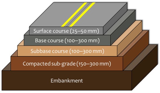Road construction relies heavily on quarried aggregates, yet DS—once dewatered and stabilized—can substitute a sizeable share of this non-renewable feedstock []. Pavements are built as a stack of four functional layers: (1) compacted subgrade, (2) subbase, (3) base (capping), and (4) surface courses (Figure 1). Most published work on dredged-material reuse targets the lower, high-volume layers where performance requirements are modest; here sediments can simply replace bulk fill after lime- or cement treatment. Far fewer studies tackle the base or surface courses, although recent research shows that processed DS can partially replace natural sand or fines in asphalt and binder mixes. For large-scale uptake, technical suitability must be matched by socio-economic viability—binder cost, local availability of DS, and regulatory acceptance ultimately govern whether sediments become a mainstream road material.