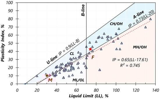 Casagrande plasticity diagram of DS-F and DS-M (red stars), superposed with the results of 98 DS (grey triangles) from 63 papers [,,,,,,,,,,,,,,,,,,,,,,,,,,,,,,,,,,,,,,,,,,,,,,,,,,,,,,,,,,,,,,]. Legend: C: Clay, M: Silt, O: Organic, H: High plasticity, L: Low plasticity. Adapted from Safhi [].