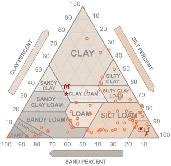 Classification of DS-F and DS-M (red stars) superposed with 74 DS (circles) in sand–silt–clay triangular diagram from 44 papers [,,,,,,,,,,,,,,,,,,,,,,,,,,,,,,,,,,,,,,,,,,,,,,]. Adapted from Safhi [].