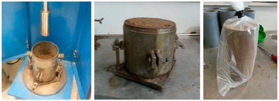 Immediately following each Proctor compaction, an IBI test was conducted on the same specimen (in the Proctor mold) according to NF P94-078 []. The IBI (also known as Immediate CBR) measures the penetration resistance of a standard piston (Ø 50 mm) driven into the compacted soil. Two readings of force are taken at 2.5 mm and 5.0 mm penetration, and the larger of the corresponding indices (scaled relative to standard pressures) is reported as the IBI%. This test simulates the ability of the compacted soil to support construction equipment shortly after compaction. Identical Proctor-IBI campaigns were run on the M-0 and M-LC mixes. Figure 5 presents the preparation of the samples. All immersion curing was carried out in tap water in accordance with NF P 94-100, which specifies potable water for soil–binder specimens.