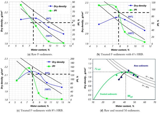 The Proctor test results (Figure 6 and Table 3) demonstrated that the untreated DS-F (F-0) has a relatively high maximum dry density (around 2.15 g/cm3) at a low optimum moisture (~7.5%). This reflects the granular nature of the DS (dominantly sand–silt). The IBI of 45% for F-0, while not extremely low, suggests that, in its compact state, the material is on the borderline of suitability for a foundation layer (which usually requires IBI ≥ 35%). It would not be adequate as a base layer without improvement, since base layers often demand higher bearing ratios (e.g., CBR > 60%). The water sensitivity of the raw DS is also a concern—as a fine-grained material with some silt and clay, if it became wetter than OWC, its strength could drop rapidly.