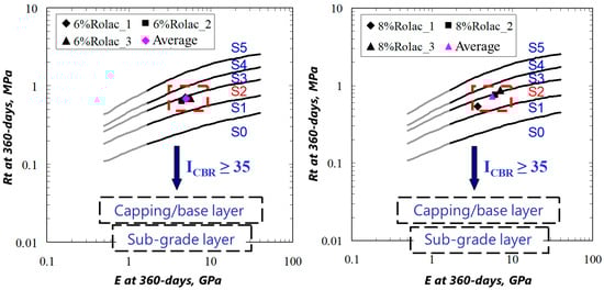 Elastic modulus and traction resistance results at 360 days: left—sediments treated with 6% HRB; right—sediments treated with 8% HRB.