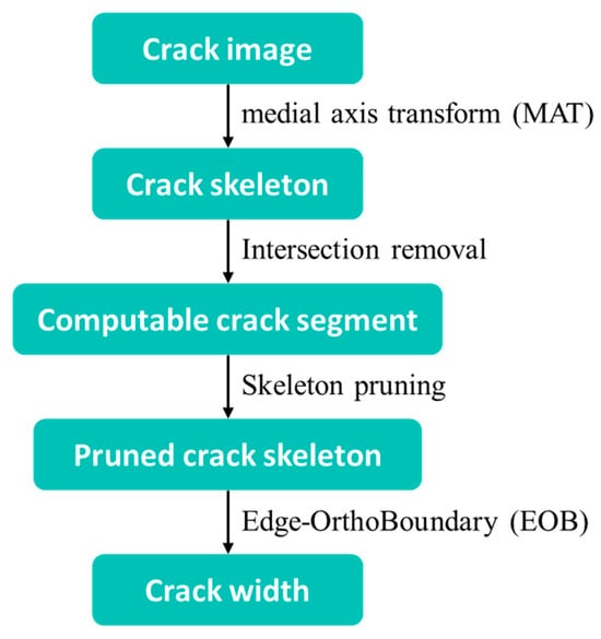 Figure 2 presents the overall workflow of the proposed method. The process begins with a crack image, from which the crack skeleton is extracted to represent the centerline of the crack using the medial axis transform (MAT). Next, computable crack segments are identified to ensure that only valid and measurable portions of the crack are considered. These segments are then refined through skeleton pruning to eliminate noise and redundant branches. Finally, the crack width is computed based on the pruned skeleton using the edge-OrthoBoundary (EOB) algorithm, enabling the accurate measurement of the crack width from image data.