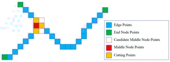 After that, the density-based spatial clustering of applications with noise (DBSCAN) algorithm [37] is employed to cluster into a number of nodes subsets (the blocks surrounded by the red dashed box in Figure 4). The maximum permissible distance between sample points within the neighborhood is specified as , and the minimum number of samples required for a core point is stipulated as one. For each subset of intermediate nodes , repeat the following steps: find an adjacent point in , move it to set E’, then find an adjacent point in that is connected to E’, and continue moving points to E’ until there are no adjacent points left in . Next, search for adjacent points in and to move them to E’, which are the cutting points (the yellow blocks in Figure 4), and move them into E’ until there are no adjacent points left. The result will be the edges (the blue blocks in Figure 4). After repeating the above operations for , the intermediate nodes will be obtained (the red blocks in Figure 4).