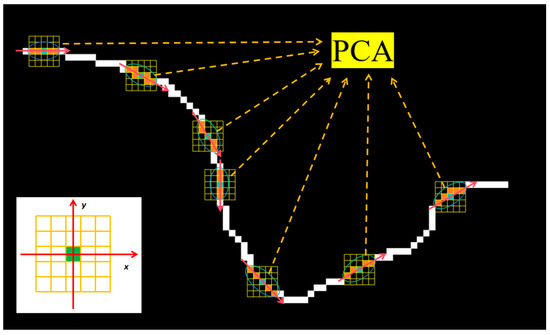 For the cutting points, repeat the following steps: First, as is shown in Figure 5, PCA is used to find the propagation direction θ of a local region at the cutting point, where the kernel size is 5 × 5, and the local region are represented by their local (x, y) coordinates.