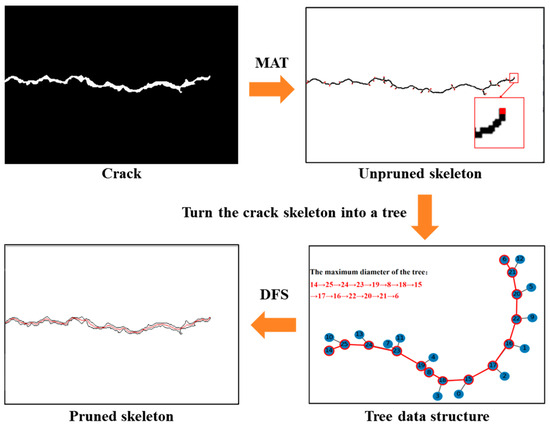 Crack-skeleton pruning is carried out to remove unnecessary branches while preserving the supporting structural elements. Thus, this paper defines the crack skeleton as the maximum diameter, or the farthest distance between nodes in the tree structure, which turns the skeleton pruning into the tree’s maximum diameter calculation.