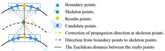 The OrthoBoundary method proposed by Li et al. [18] is an improvement over the OP method, as shown in Figure 1b. Based on the two boundary points obtained from the OP method, the OrthoBoundary method further optimizes the results. The OrthoBoundary method uses the PCA algorithm to calculate the propagation direction vectors of these two boundary points, converts them into angles in the global coordinate system, and computes the average angle with the propagation direction angle of the skeleton point, which serves as the new propagation direction for the skeleton point. The remaining parts of the OrthoBoundary method are repeated to obtain the two boundary points, and their Euclidean distance is defined as the crack width.