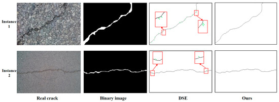 As for cracks with a simple morphology, there is no need for intersection removal. A comparison of our skeleton-pruning algorithm and the DSE algorithm in two instances (for an oblique crack and horizontal crack) is shown in Figure 8. The threshold for the DSE algorithm is 0.005, which is consistent with the recommendation provided in Li’s study [18]. The DSE algorithm failed the skeleton pruning, as some spurious skeleton branches were retained (see green lines). The pruning results of our algorithm are satisfactory, as the pruned skeleton fitted well with the crack without spurious branches. From the perspective of time complexity, the time complexity of the DSE algorithm is O(n2), while the time complexity of our algorithm is O(n), making it more time-efficient.