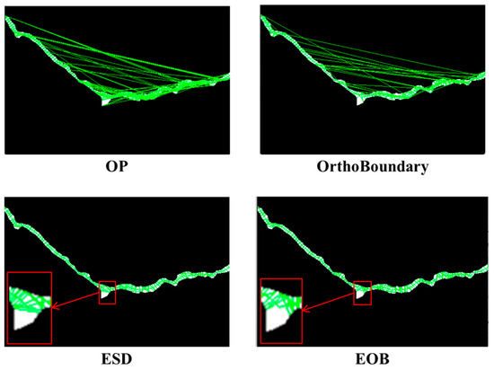 As is illustrated in Figure 9, the visual comparison of the width measurement of cracks with a simple morphology is demonstrated using the OP, OrthoBoundary, ESD, and EOB methods, where green lines represent the measured width results. It is evident that the results from the OP and OrthoBoundary methods are overestimated for the crack with a large curvature. However, compared to the results of the OP method, the OB method has fewer unreasonable estimates, demonstrating the effectiveness of its improvements. The width measurements obtained from the ESD and EOB methods are reliable and very close, as both take into account the size and direction of the crack width. As is illustrated in the corners (see red box), the results from the EOB method are more reasonable in terms of direction and size when compared to the ESD method. This is due to the fact that the EOB method corrects the local direction of the crack-skeleton points based on the crack boundary points.