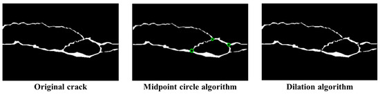 As for the cracks with multiple intersections, a comparison of the midpoint circle algorithm and our intersection removal algorithm is presented in Figure 10. The dilation algorithm successfully eliminates the intersections and breaks them into simple linear segments. This algorithm achieves equivalent results to the midpoint circle algorithm used by Ong et el. [17], but it retains more of the original crack, which is very important in terms of crack quantification and is appropriate for the case where the crack width is only one or two pixels.