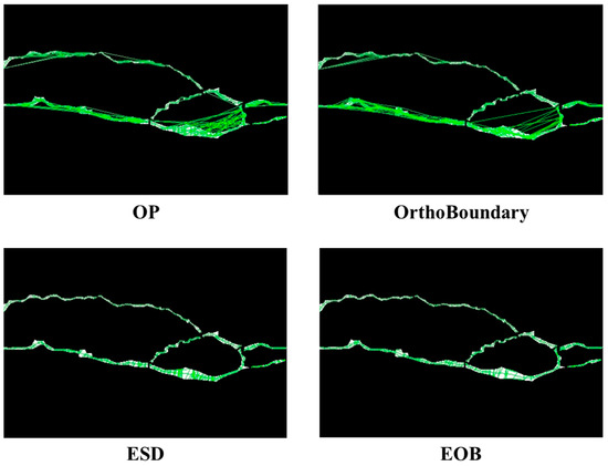 Figure 11 depicts the width measurement results of cracks with multiple intersections, where the green lines represent the measured crack width. Both the OP and OrthoBoundary method yield erroneous measurements in the region of a high crack curvature. This is attributable to the method’s sole consideration of direction, resulting in the erroneous identification of boundaries. The error estimation of the OrthoBoundary method is less than that of the OP method, indicating its effectiveness in terms of improvement. Both the ESD method and the EOB method improve its measurement by considering the size factor. In terms of detail, the EOB method has been shown to be superior to the ESD method, as its span is more reasonable, as demonstrated in the red box, due to the boundary-based correction of the crack-width propagation direction.