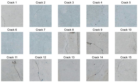 There are ambiguities caused by subjectivity in crack-width measurement manually. Consequently, we generated fitted cracks based on the real crack skeleton to facilitate a comparison of the methods. The real crack skeletons were obtained using the MAT method from 15 pictures of a concrete crack dataset in our previous research [39], where the picture size is 256 × 256 pixels. The cracks in these images were all concrete wall cracks captured under good lighting conditions, including 13 single cracks and 2 intersection cracks, as shown in Figure 12.