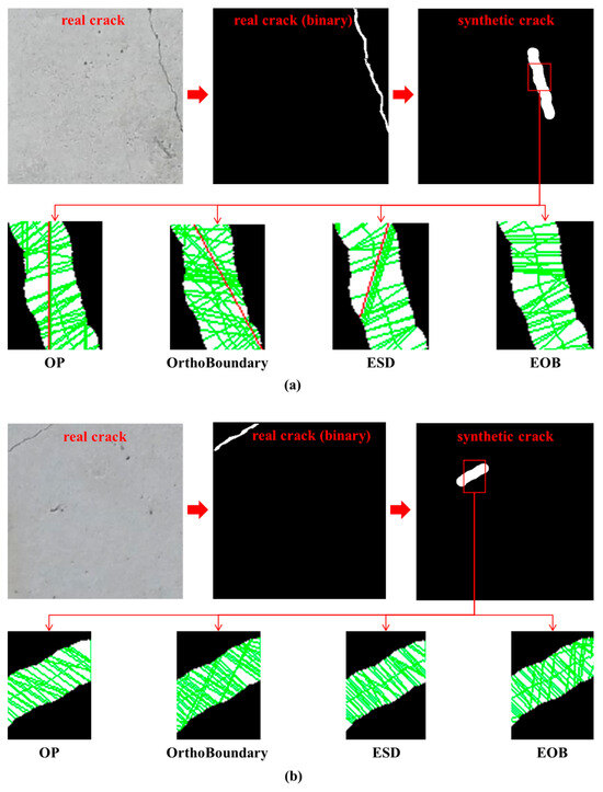 In scenarios where multiple cracks exist along the orthogonal direction of the crack-skeleton point, or where the crack exhibits substantial curvature, the OP method tends to produce overestimated results. Although the OrthoBoundary method offers further refinement of the orthogonal direction at the skeleton point, it remains constrained by the OP method’s inherent sensitivity to pixel shift. In contrast, the ESD method does not yield overestimated results due to pixel shifts; rather, its outcomes are contingent upon the propagation direction of the crack-skeleton point. Consequently, the accurate determination and adjustment of this propagation direction are particularly critical for the crack-width measurement.