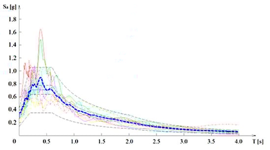 Nonlinear dynamic analyses (NDAs) were performed to accurately assess the post-seismic robustness of the designed structures. The accuracy of seismic input representation is crucial for assessing the structural performance of moment-resisting frames under extreme scenarios. Recent studies [] have highlighted that realistic loading protocols, including those based on cumulative energy demand, can significantly influence the predicted ductility and failure mechanisms of frame components. In this study, natural ground motions scaled to Eurocode 8 spectra are adopted, ensuring compatibility with design conditions while capturing the essential features of seismic demand. These signals were selected according to Eurocode 8 [], using the SelEQ application []; the data of the records are reported in Table 3, while the comparison of individual and average signal response spectra with the target ones provided by EC8 is shown in Figure 2: the scaled signals provide a very good fit with the target response spectra, namely, in the period range corresponding to the natural periods of vibration of the analysed structures.
