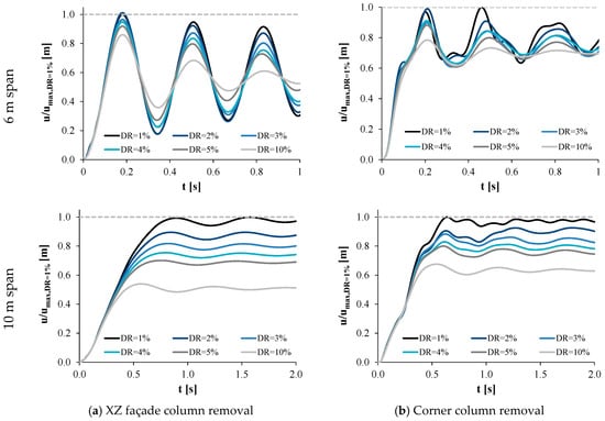 - The damping ratio (DR): This parameter was found to significantly affect the dynamic response under column loss []; a sensitivity analysis was performed to investigate the influence of the damping ratio, by varying it between 1% and 10%, and to determine the value to be assumed during the NDA.