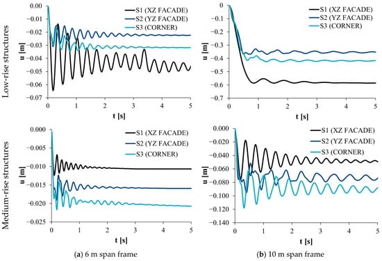 The obtained results generally indicate that the seismic action does not introduce significant variations in the maximum dynamic vertical displacements under the subsequent column loss action, since small damage levels are introduced by the seismic action. Two examples of this are presented in Figure 15, where the frame in Figure 15a is characterised by a predominantly elastic response to column loss (DOPDAZ ≈ 0.5), while the frame in Figure 15b is characterised by a predominantly plastic response to column loss (DOPDAZ ≈ 1.0).