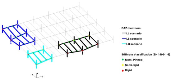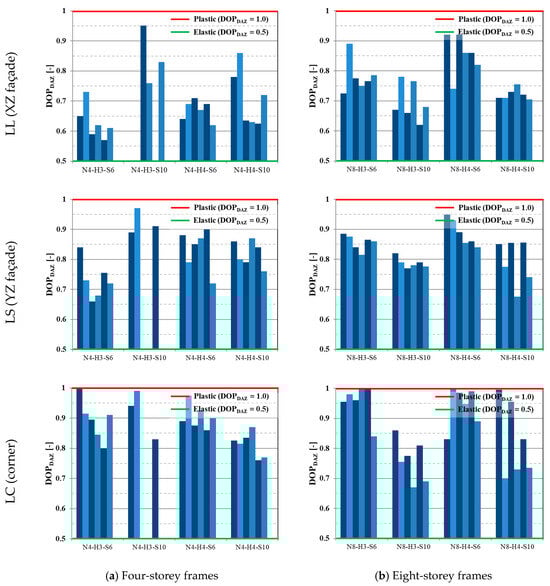 The degree of plasticity of the directly affected zones (DOPDAZ ratios, see Equation (4)) for the considered column removal scenarios is presented in Figure 11 for low- and medium-rise frames (zero corresponds to collapsed structures). The numerical results show that significant plasticity is required to arrest a progressive collapse, with DOPDAZ ratios higher than 0.5 in all cases. Figure 10 shows that corner column loss cases require the development of a higher level of plasticity in the DAZs in comparison to façade losses. In turn, by comparing the two façade removal cases LL (XZ façade) and LS (YZ façade), it is possible to verify that higher DOPDAZ ratios are obtained for the LS case. The differences in terms of the degree of plasticity are mainly attributed to the different secondary frame systems that are activated upon column removal, as shown in Figure 12. For the LL case, the mobilised secondary frame joints are nominally pinned and, hence, more flexible, which explains the lower DOPDAZ ratios. Conversely, for the LS case, the main mobilised gravity frame joints are semi-rigid partial-strength joints, which are comparatively more rigid and therefore tend to develop plasticity for lower rotational demands, leading to higher DOPDAZ ratios. For the interstorey height, no correlation was found with the degree of plasticity. The span variable was found to influence the DOPDAZ ratios, namely, for four-storey frames, which have inherently lower structural robustness and which for 10 m span frames display an average DOPDAZ ratio increase of 11% when compared to the corresponding 6 m span frames. This is due to long-span systems being required to further develop catenary action and connection plasticity in order to arrest the collapse. Conversely, for eight-storey structures, which display much higher robustness due to the higher number of elements in the DAZ that are mobilised under column loss, 10 m span frames display an average decrease in the DOPDAZ ratios of 13% when compared to 6 m span frames. This difference is explained by the lateral sway limitation requirements for the eight-storey 10 m span frames, which require large profiles that tend to develop less plasticity under column loss.