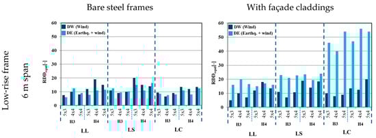 Reserve Displacement Ductility is reported in Figure 13, where the effect of claddings is also highlighted (results are separately presented for the bare steel frame and for the frame with façade claddings (masonry for DW cases, and CF for DE ones); zero values of RDDequil are indicative of collapsed frames).