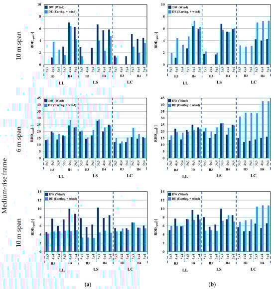 For the loading scenario DE (wind + earthquake), the structures were designed according to capacity design criteria compliant with EC8 to guarantee a weak beam–strong column mechanism type; conversely, for loading scenario DW (wind), no hierarchy of resistances was considered, structural members were designed to fulfil all limit states according to EC3, and a strong beam–weak column failure type was obtained.