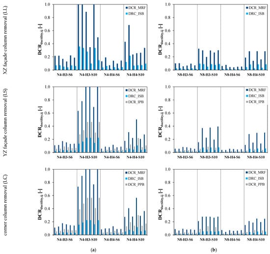 The results for the LL, LS, and LC cases for four-storey and eight-storey frames are presented in Figure 14, where DCR ratios of 1.0 are indicative of member/connection failure and where MRF, ISB, IPB, and PPB stand for moment-resisting frame, Internal Secondary Beam, Internal Primary Beam, and Peripheral Primary Beam, respectively.