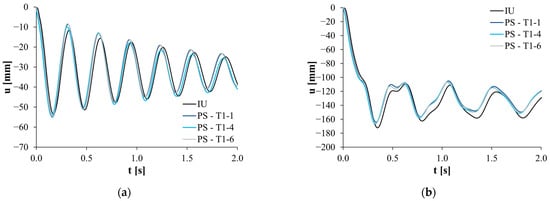 Displacement time-history comparison between initially undamaged (IU) and post-seismic (PS) column loss: (a) façade column loss for the N4-H3-S6-CN-T5×4-DE frame and (b) corner column loss for the N4-H4-S10-CN-T5×3-DE frame.