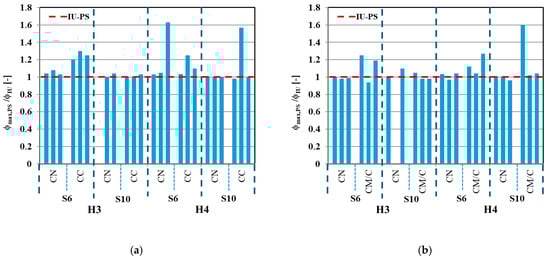 Figure 16 compares the response of the designed frames in terms of the rotation demand between the IU and PS scenarios: the chord rotation demand PS/IU ratios are very low, with ratio values being close to 1 for nearly all cases. Furthermore, all IU structures that arrested the progressive collapse also arrested the collapse in the PS scenarios, while structures that collapsed in the IU case (N4-H3-S10-CN-T5×3-DE-LL and N4-H3-S10-CN-T4×4-DE-LC) also collapsed in all PS scenarios, as expected.