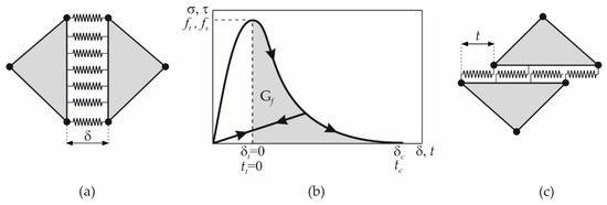 The fracture and fragmentation algorithm aims to enable crack initiation and propagation through discrete elements. This is modelled with zero thickness contact elements implemented between the finite element mesh [40]. When two finite elements tend to separate in tension and/or shear as shown in Figure 1, tensile and/or shear stresses occur in the contact elements. The tensile stresses are a function of the separation δ, while the shear stresses are a function of the separation t. Before the tensile or shear strength is reached, normal separation δt and shear separation tt are theoretically equal to zero. In FDEM, this is achieved by using the penalty function method so that the axial separation δt and the shear separation tt tend towards zero as the penalty coefficient increases.