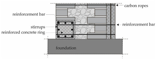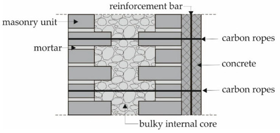 In this study, the retrofitting of the towers is designed in such a way that all external walls were first grouted, and then injected in order to fill all cavities and connect the bulky internal core with the external layers. Finally, reinforced concrete core was constructed within the perimeter walls and connected to the masonry walls in the transverse direction with carbon ropes which are branched and fixed to the ends of the walls with epoxy resin. A schematic representation of the cross-section of the wall after retrofitting is shown in Figure 3.