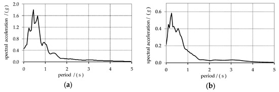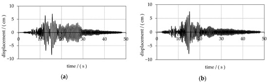In order to gain insight into the seismic resistance of the towers before and after retrofitting, each of the towers was subjected to the horizontal and vertical ground acceleration recorded during the 1979 Petrovac earthquake in Montenegro, whose amplitudes are shown as a function of time in Figure 6, while corresponding elastic acceleration response spectrum are shown in Figure 7. The amplitudes of the earthquake gradually increased until the structure collapsed. The collapse-inducing ground acceleration at which the structure collapsed was used as a measure of seismic resistance.