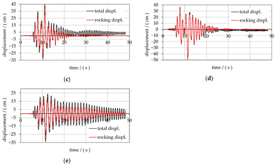 Displacements of the top of the towers fixed to the base for: (a) tower A and agr = 0.30 g; (b) tower B and agr = 0.25 g; (c) tower C and agr = 0.15 g; (d) tower D and agr = 0.25 g; (e) tower E and agr = 0.25 g.