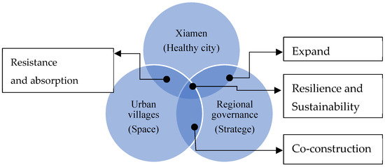 This study takes Xiamen City, urban villages, and Bay Area governance as three main categories. This study holds that in order to achieve the goal of a healthy city through the strategy of Bay Area governance in Xiamen, it is necessary to transform the spatial resources of urban villages in the Bay Area into sources of resilience and sustainability. The ways of transformation include the expansion of strategic space, the resistance or absorption of urban space, and the co-construction of city and strategy (Figure 1).